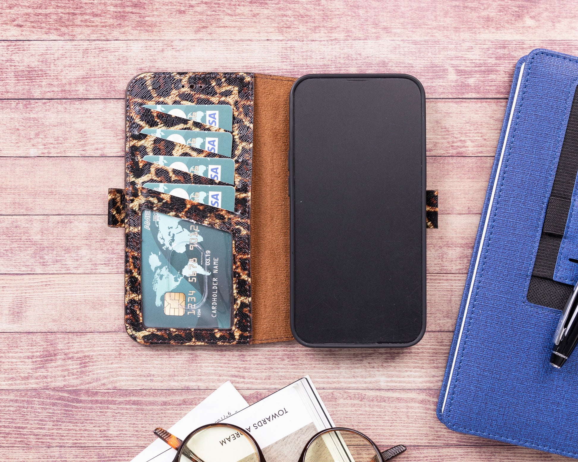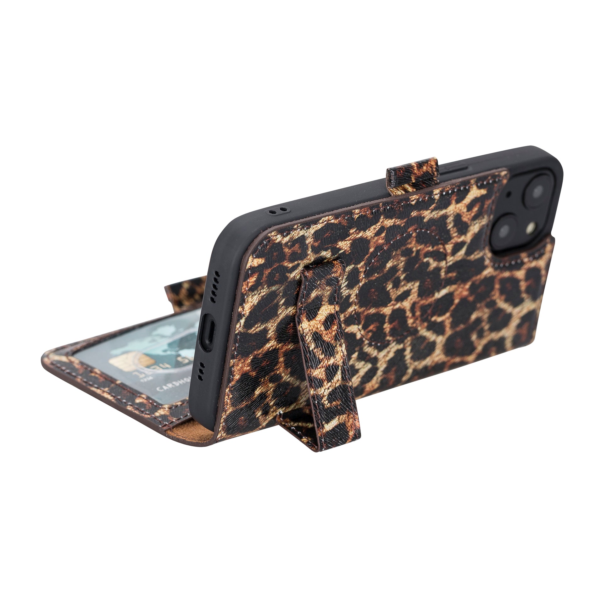 iPhone 13 (6.1") Leather MagSafe Stand Wallet Case RFID Protection - Black Leopard